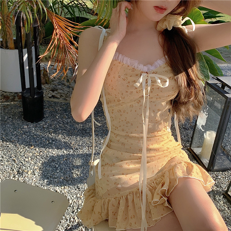 Fashion Floral Lace Wrapped Hip Ruffle Dress